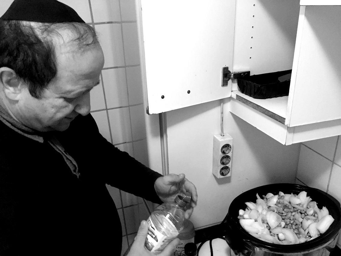 Seit einem Vierteljahrhundert geht Tomi Fried in die Grünangergasse beten, und, natürlich! isst er daheim koscher. Was, wenn er den Tscholent nicht zubereitet, weil er verreist oder krank ist? „Für 48 von 52 Samstagen mache ich es. Aber wenn ich nicht da bin, gibt es schon auch andere, die Tscholent kochen können.“