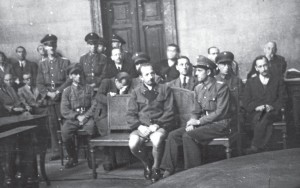 Erster Volksgerichtsprozess im Wiener Landesgericht gegen Kriegsverbrecher. Die Angeklagten auf der Bank v.l.: Polikovsky, Kronberger, Neunteufel, Frank