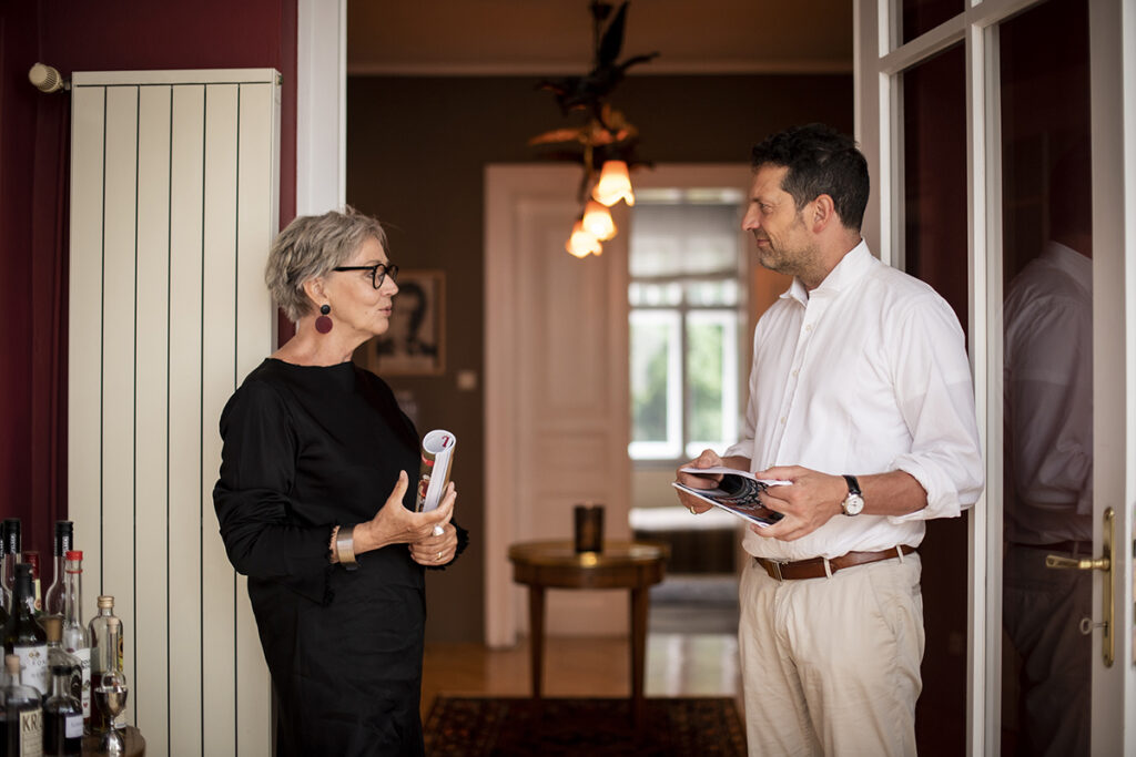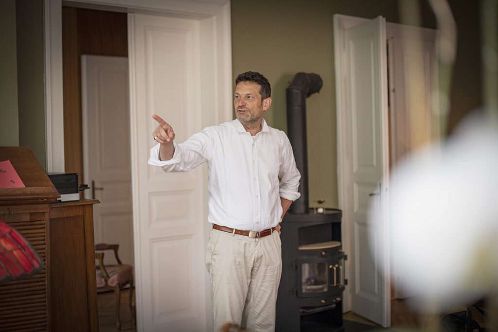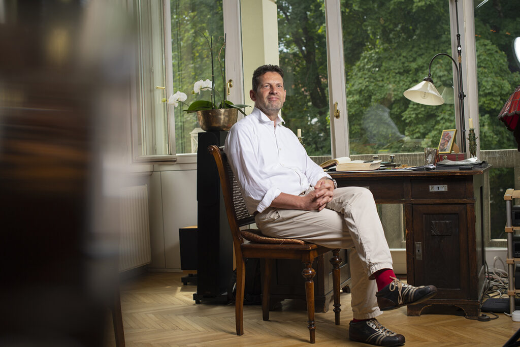 Wir sitzen auf der überdachten Veranda. Regen prasselt aufs Dach. Aus antiken Pendel- und Wanduhren tropft die Zeit. „Viele Jugendliche wissen gar nicht mehr, dass es mechanische Uhren gibt und wie sie funktionieren. Ich liebe alle mechanischen Dinge. Im Büro habe ich ein Grammophon, wie Thomas Mann es im Zauberberg beschreibt. Es klingt so, als stünde der Sänger neben einem. Als ich das erste Mal eine Platte auf dem Grammophon hörte, war ich wirklich sehr berührt. Das Digitale ist zwar toll, aber kalt, doch das Analoge ist fantastisch. Und der Klang der mechanischen Uhren macht die Atmosphäre in meiner Wohnung aus. Die Uhren leben, sie sind autonom, gehen vor und nach. Aber trotz der vielen Uhren“, sagt er und lacht verschmitzt, „komme ich fast immer ein bisschen zu spät.“